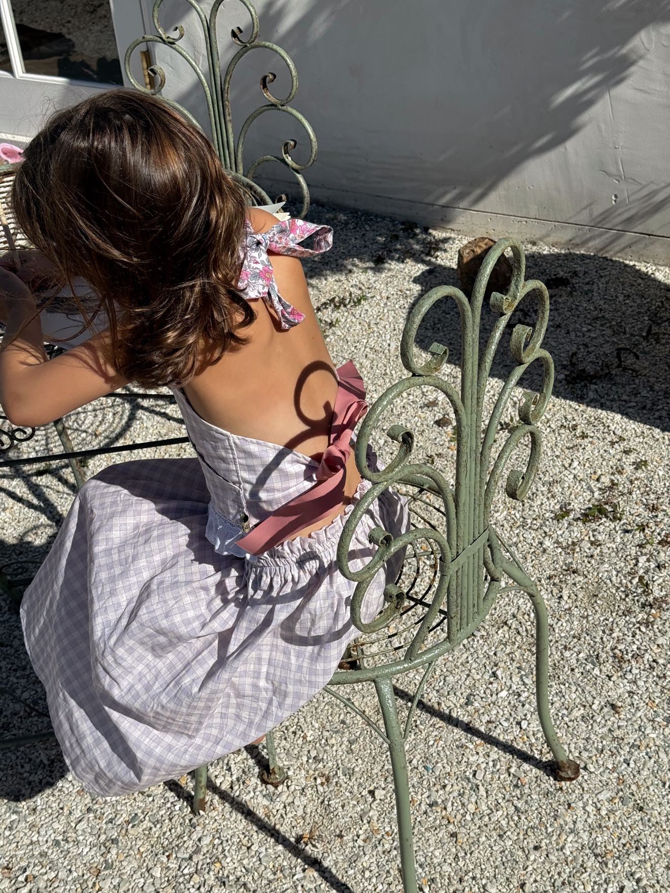 - Soft lavender gingham skirt with fine pink line and soft creamy background
