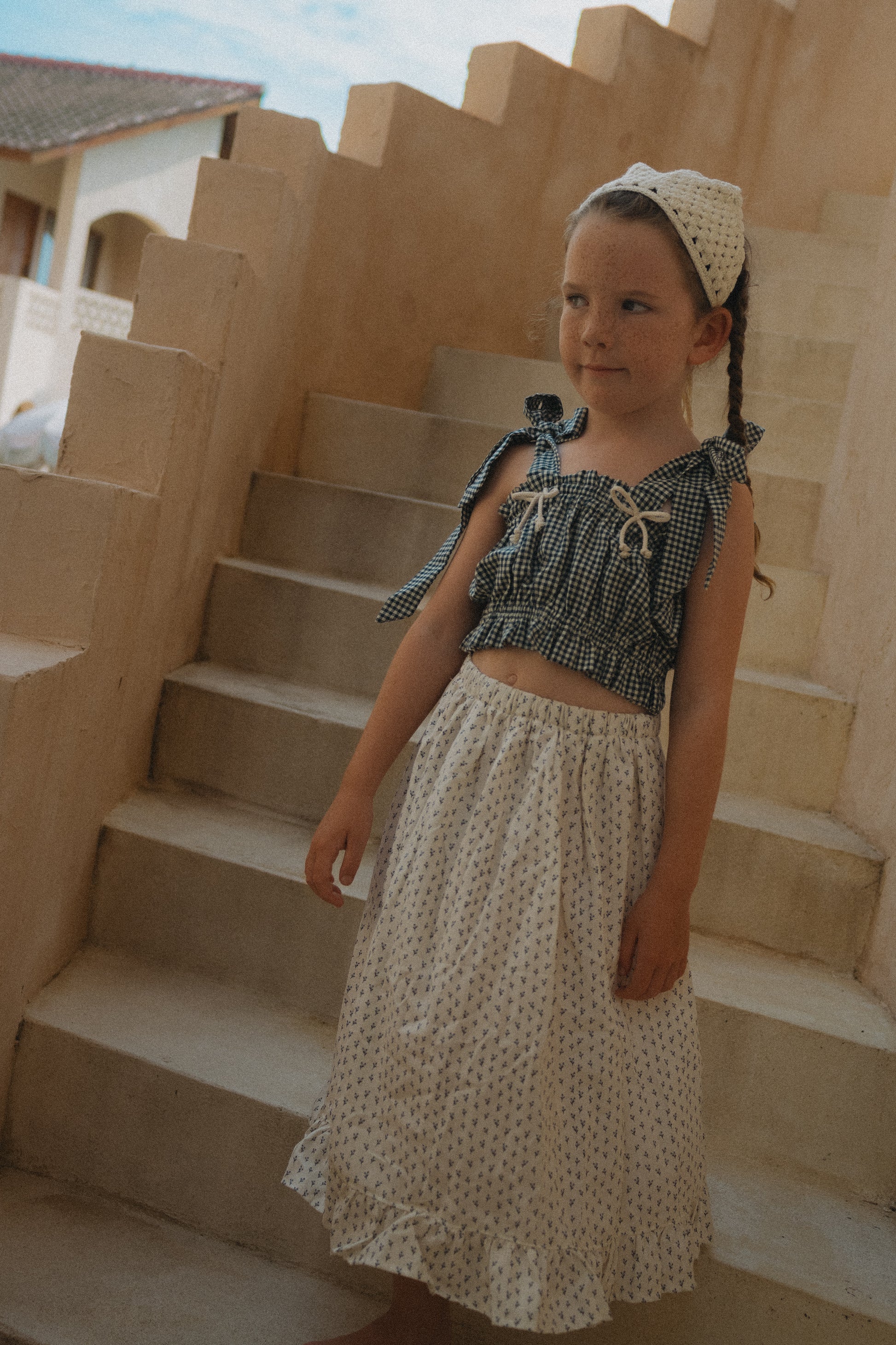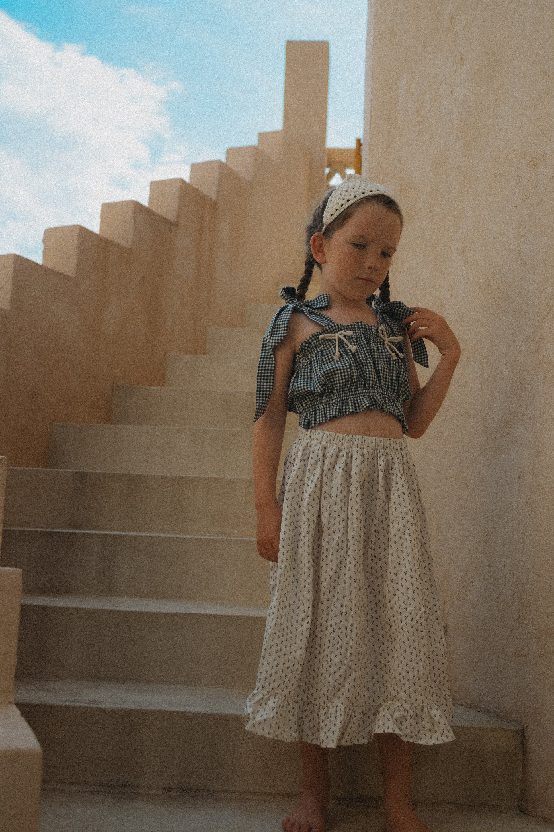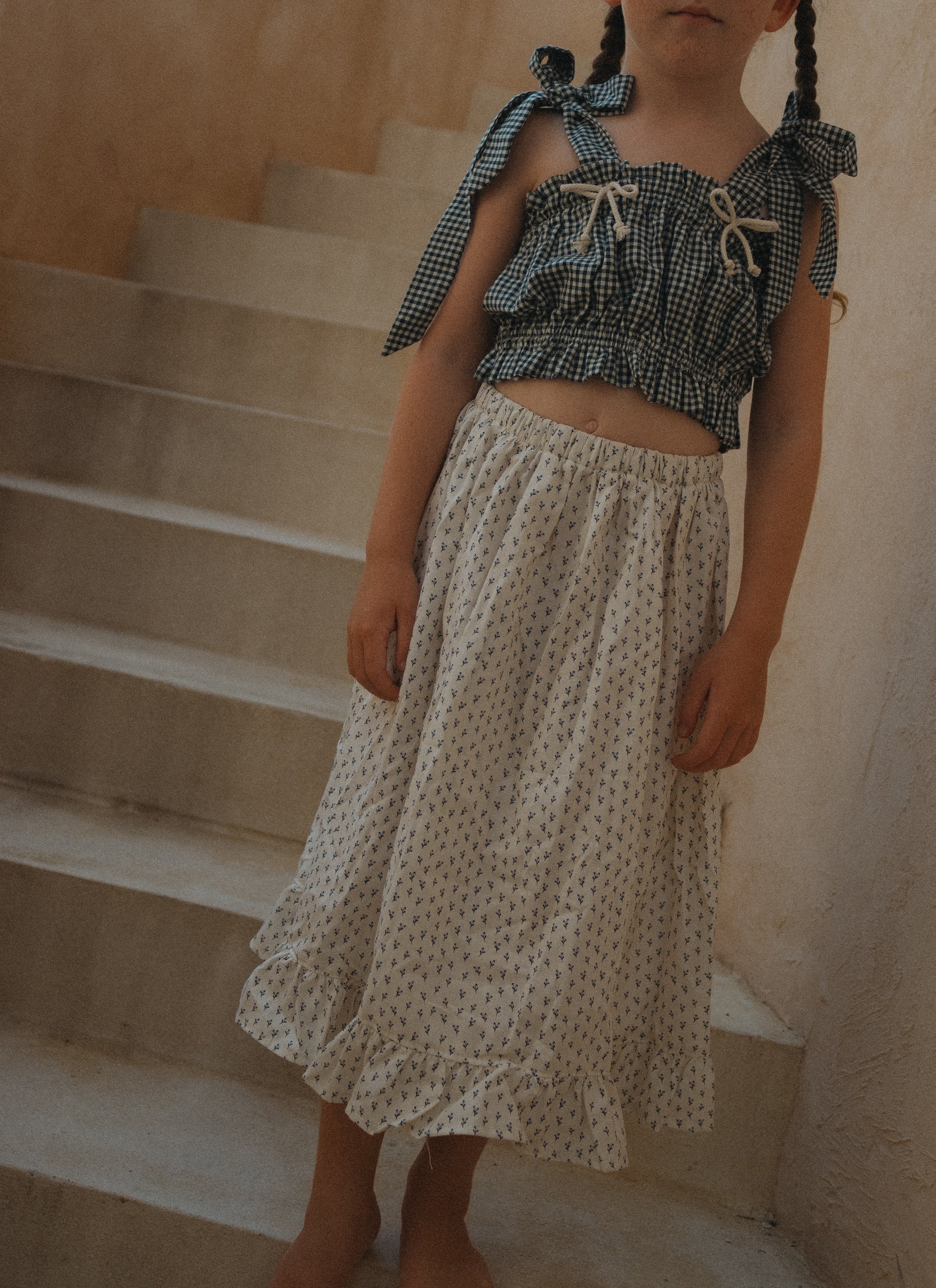 - This adorable skirt has a soft creamy background with a small navy and light blue flower pattern.