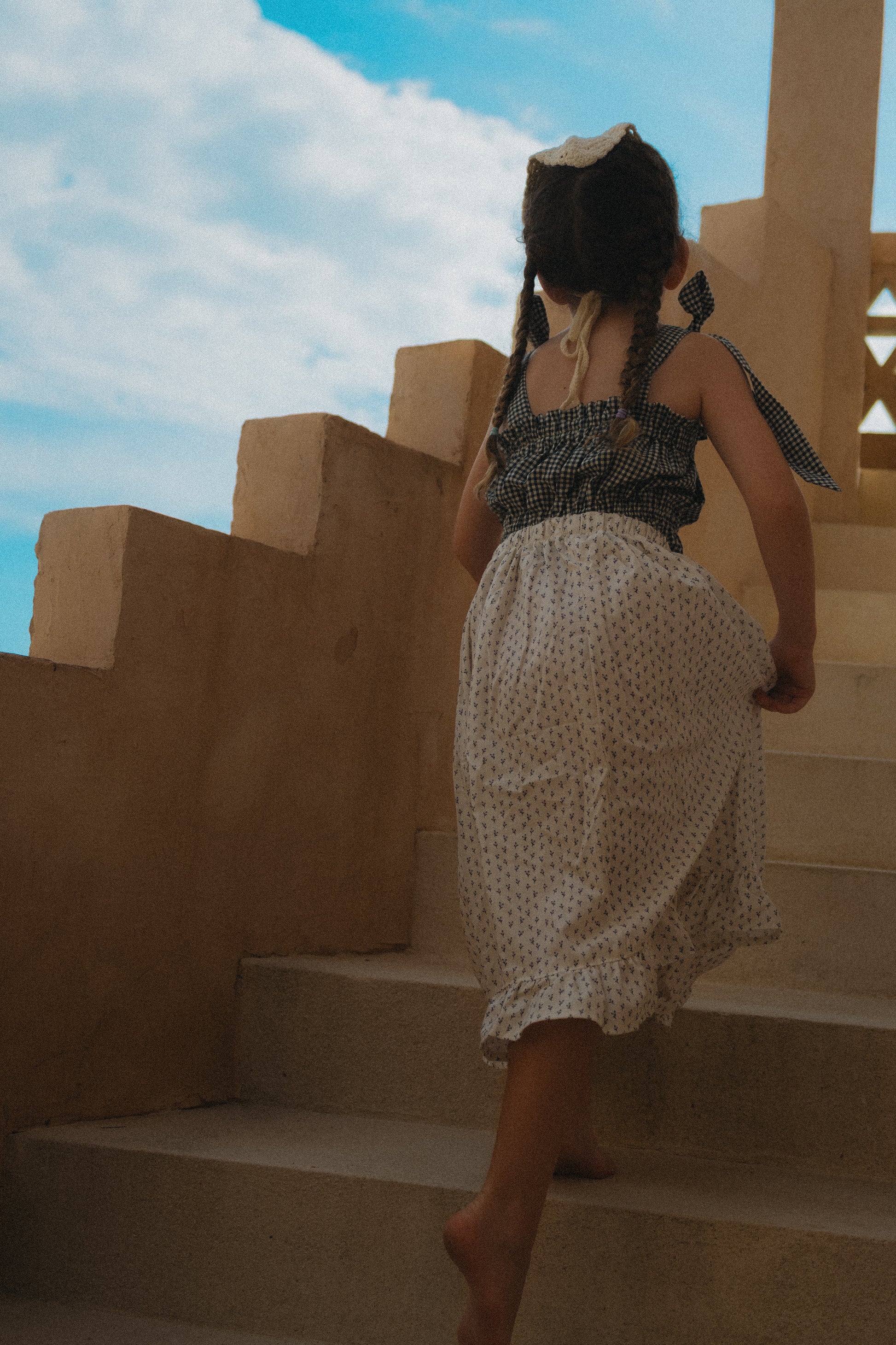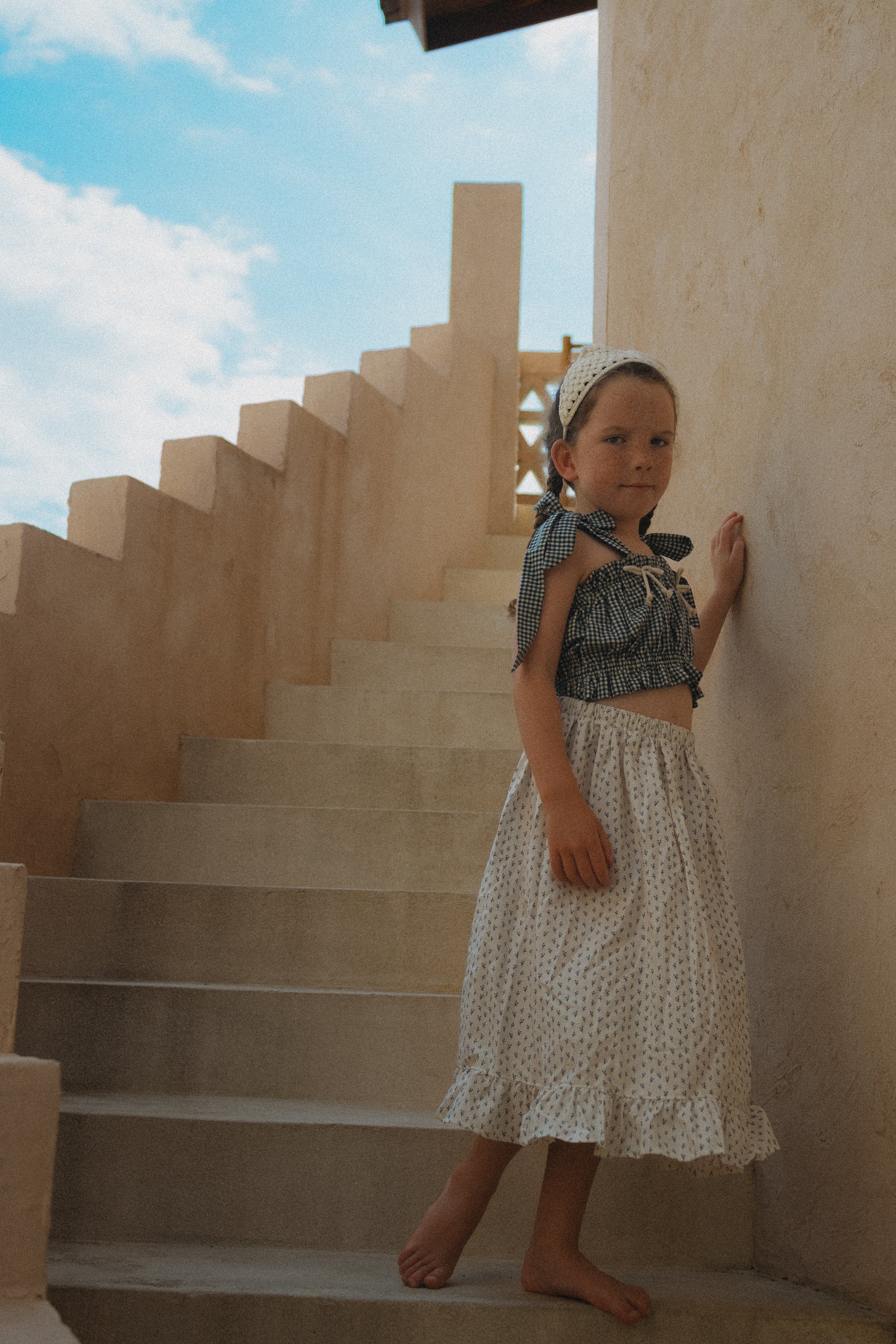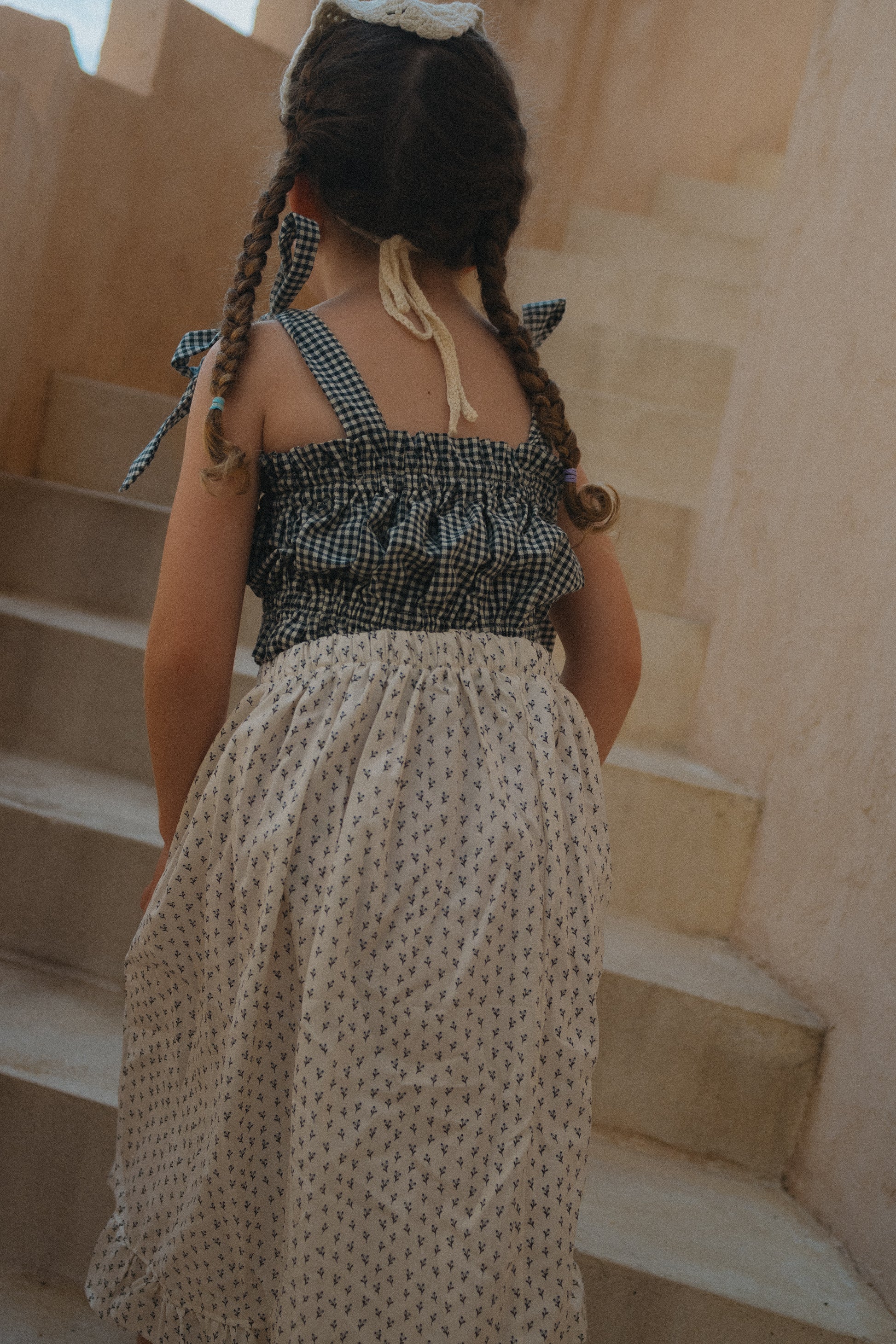 - This adorable skirt has a soft creamy background with a small navy and light blue flower pattern.