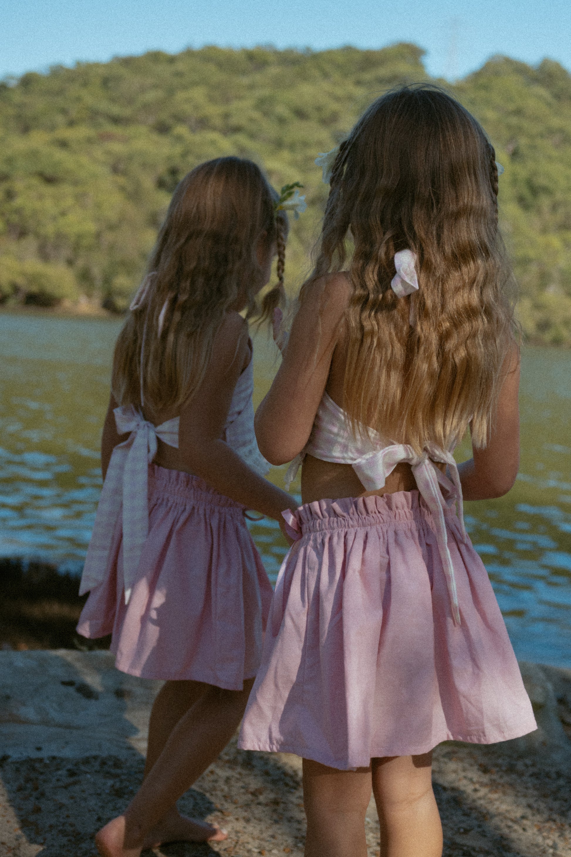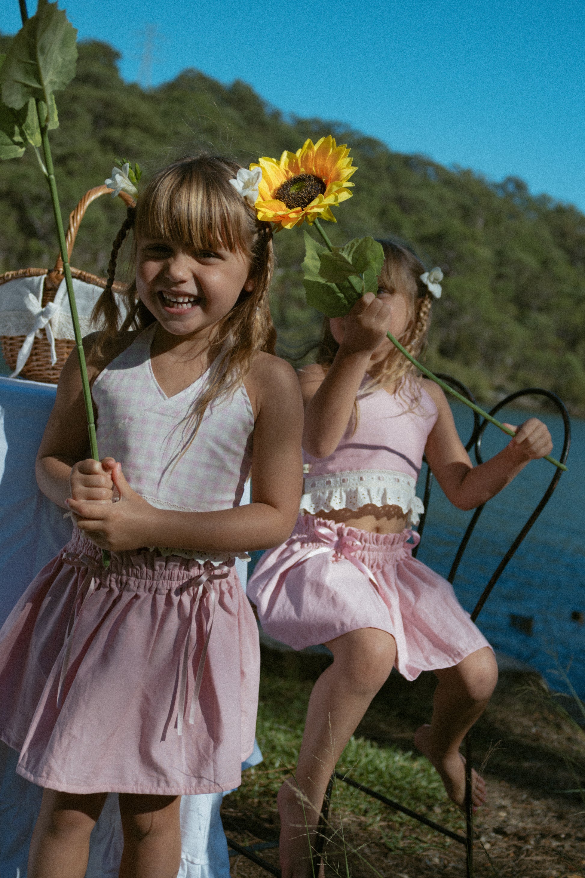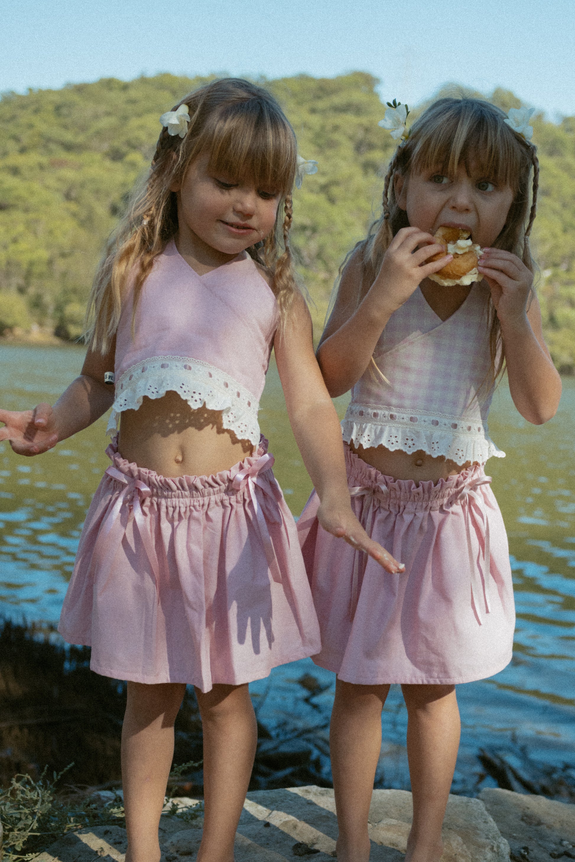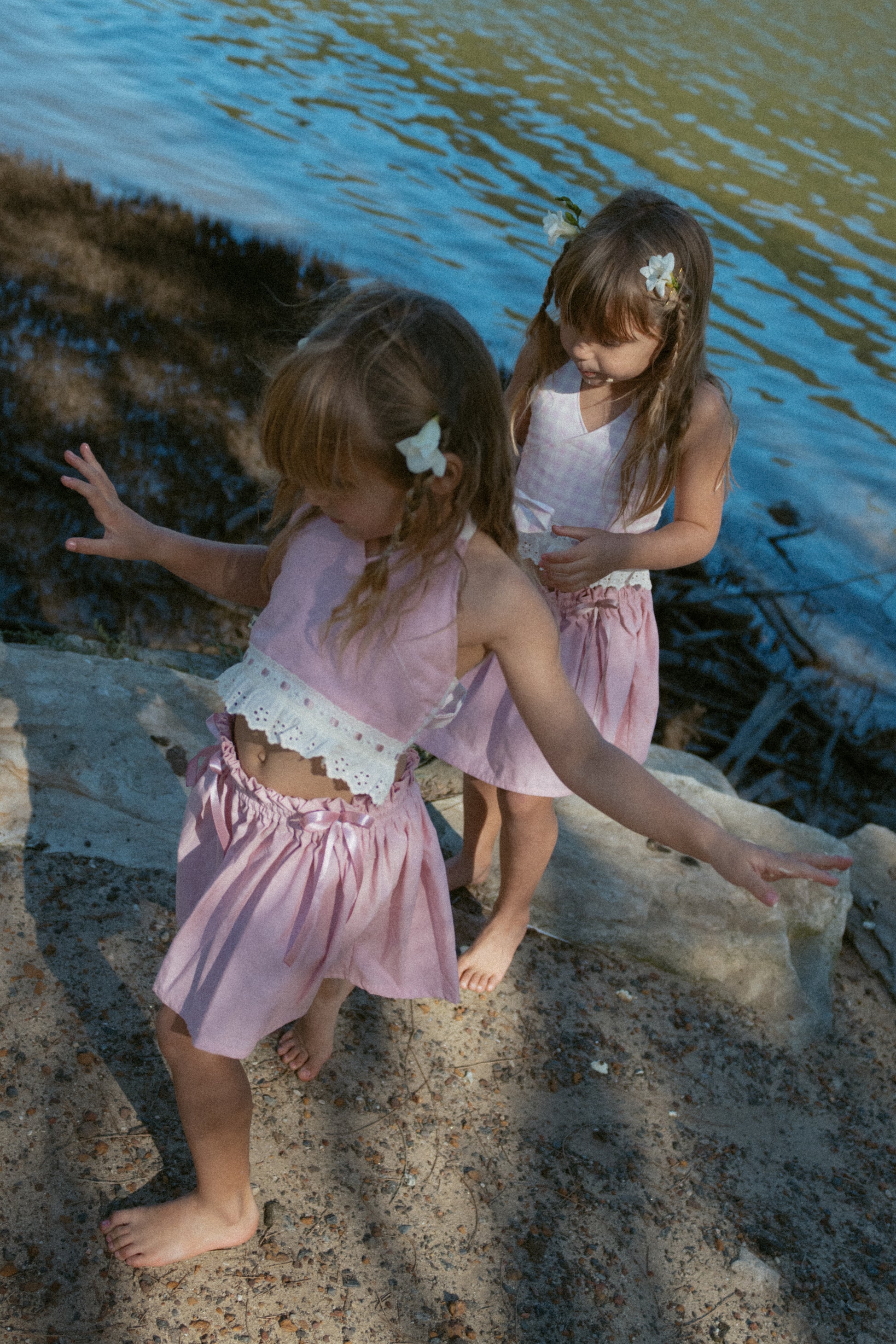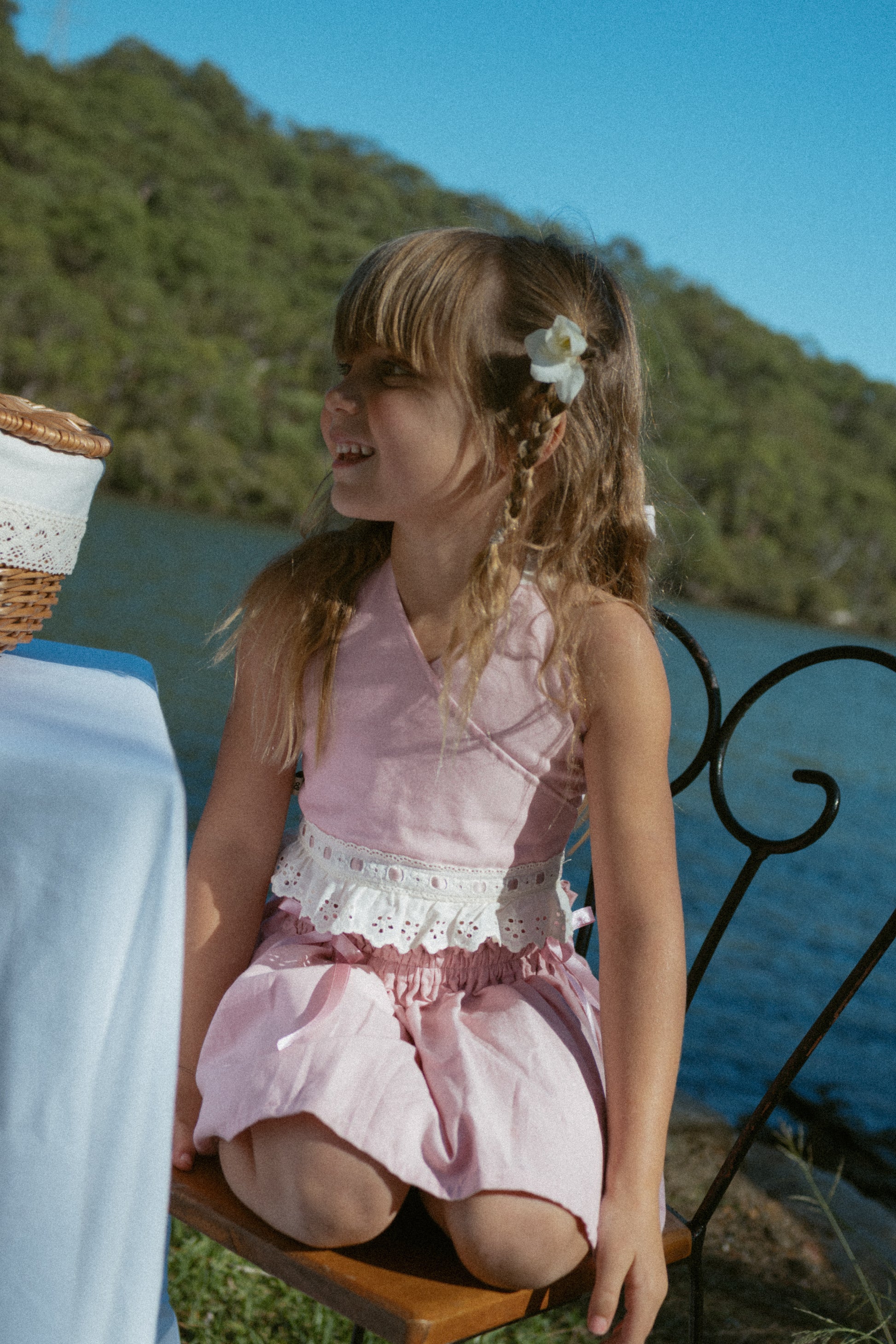 - Edged in Ivory Broderie Anglaise lace trim layered with eyelet trim with dusty pink satin ribbon threaded through.