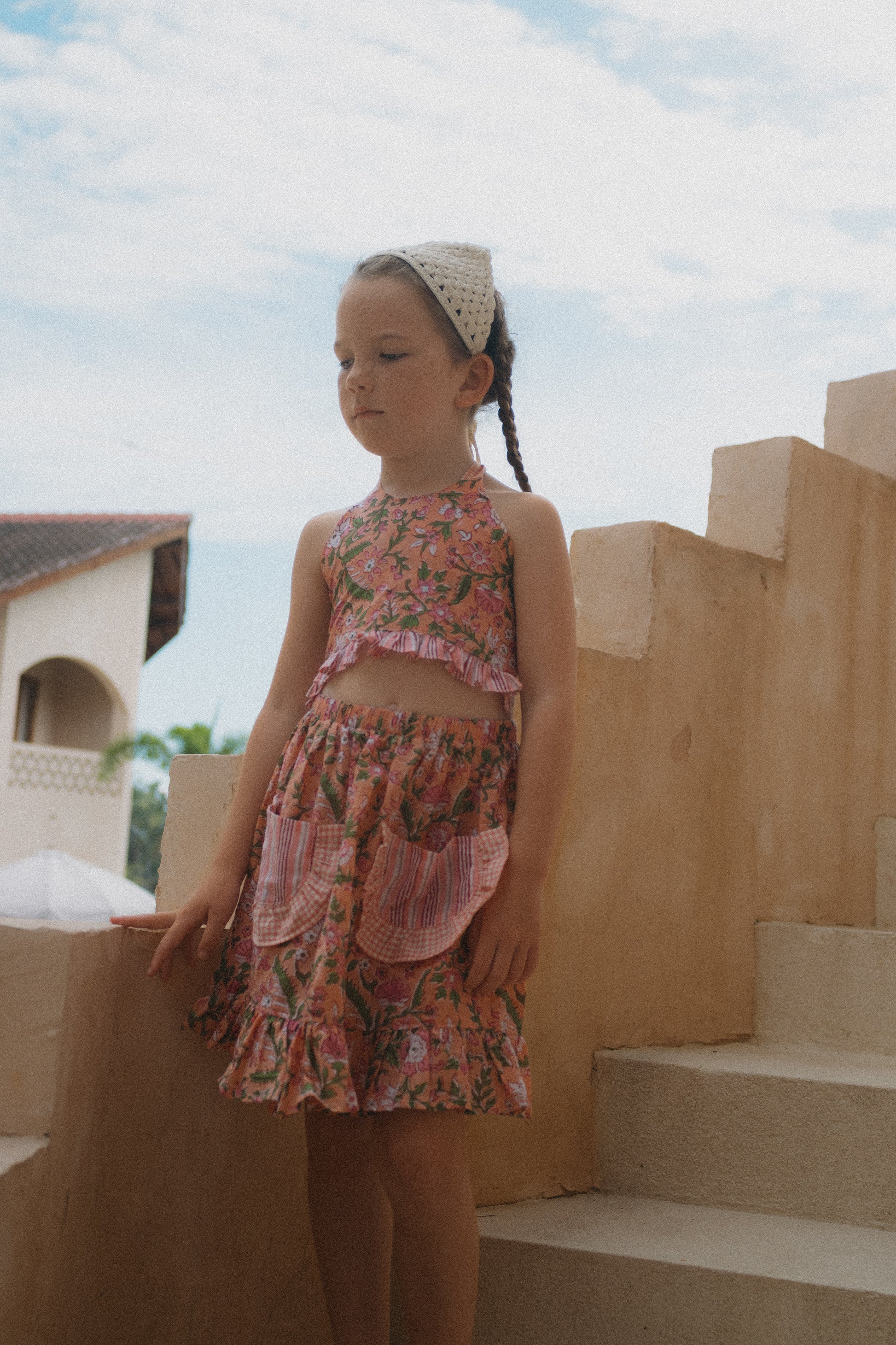 - Oversized pockets to front of skirt in striped fabric and mini gingham frill